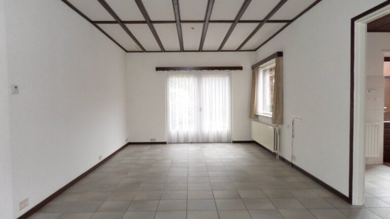 De woonkamer met openslaande tuindeuren heeft een afmeting van 3,4 x 8,23 meter. De ramen aan de achterzijde zijn voorzien van rolluiken.