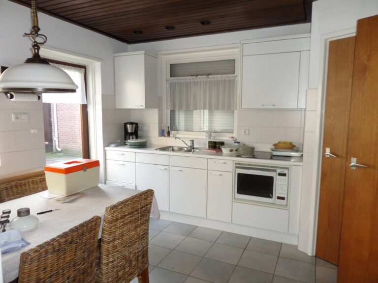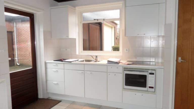 De keuken heeft een oppervlakte van ca. 10 mยฒ en geeft toegang tot de woonkamer, kelder en achtertuin. De keuken is voorzien van voldoende kastruimte, kookplaat en afzuigkap.