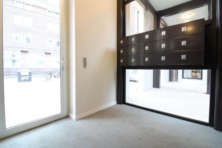 Centrale entree voorzien van postvakken en lift. De huurders van het complex kunnen eveneens gebruik maken van een gemeenschappelijke fietsenberging.