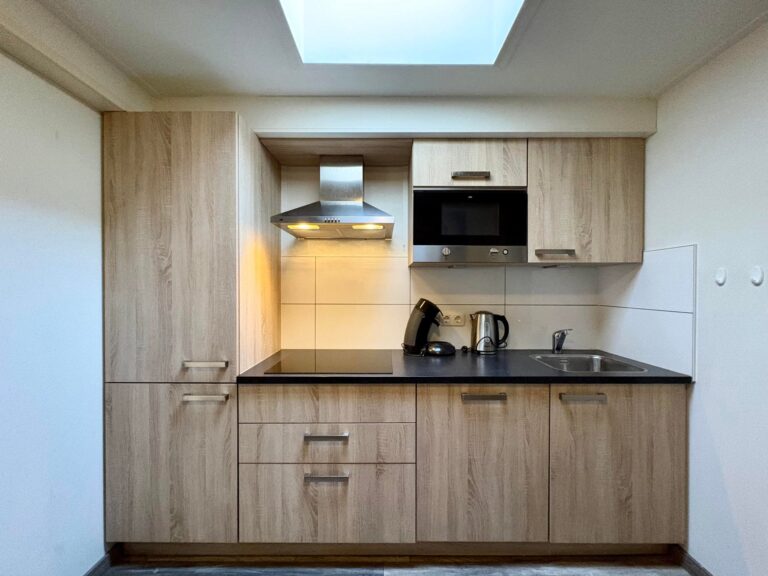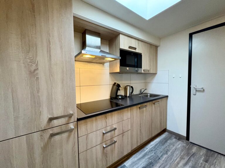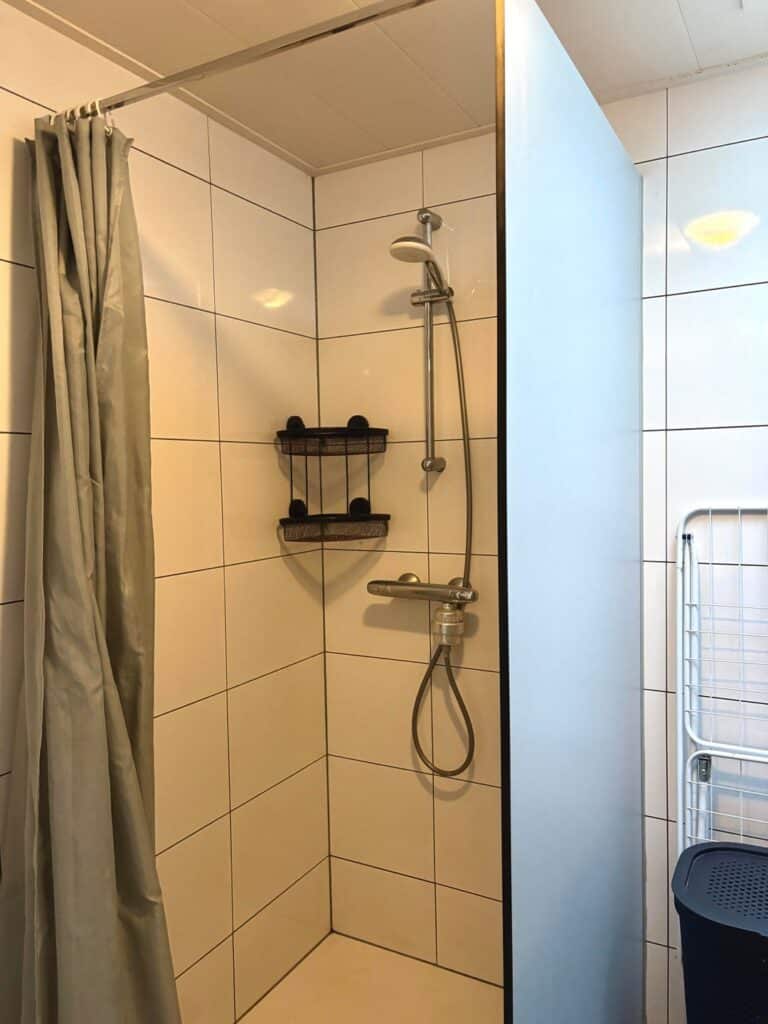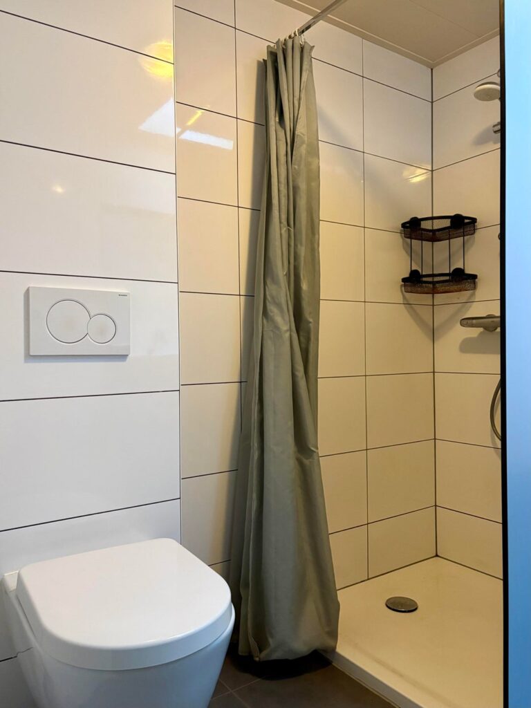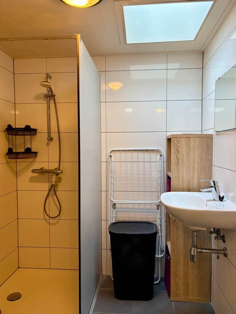 Achter de keuken bevindt zich de nieuwe badkamer, met inloopdouche, wasmeubel met wastafel en een toilet.