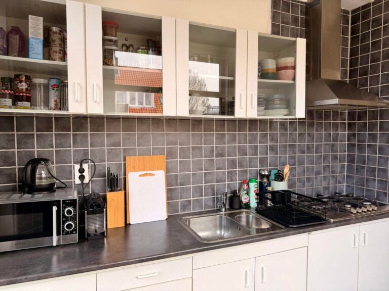 De keuken is lekker licht en is voorzien van een eenvoudig wit keukenblok, voorzien van gaskookplaat, afzuigkap en afwasmachine.