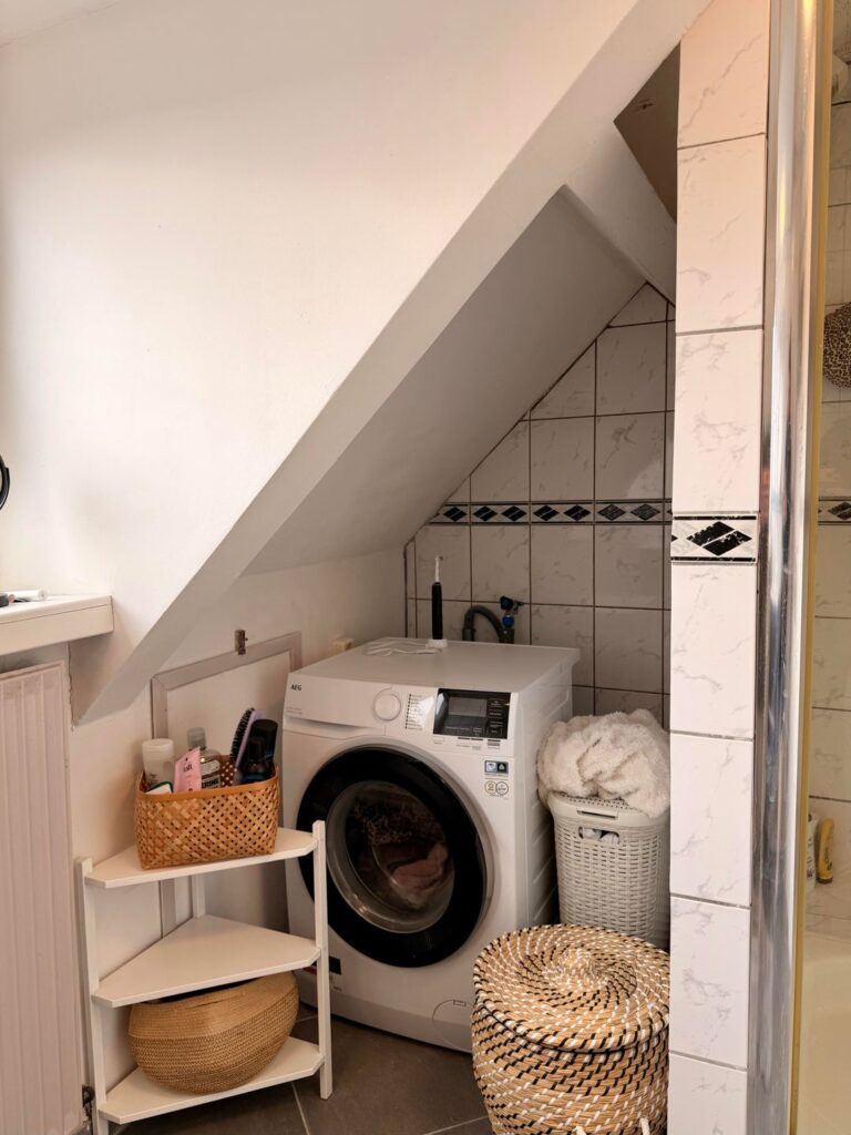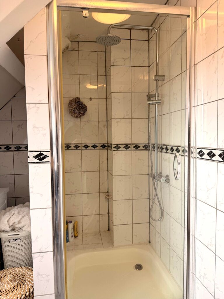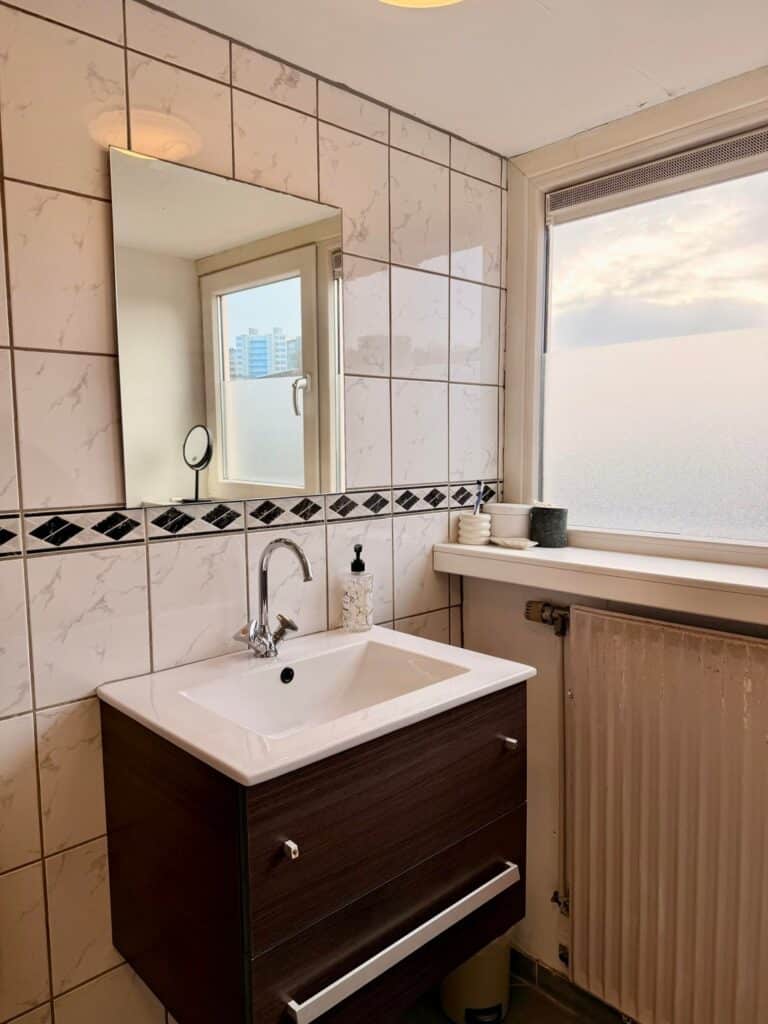De badkamer is grotendeels betegeld in grijstinten en is voorzien van een douchecabine met regendouche en een wastafelmeubel.
