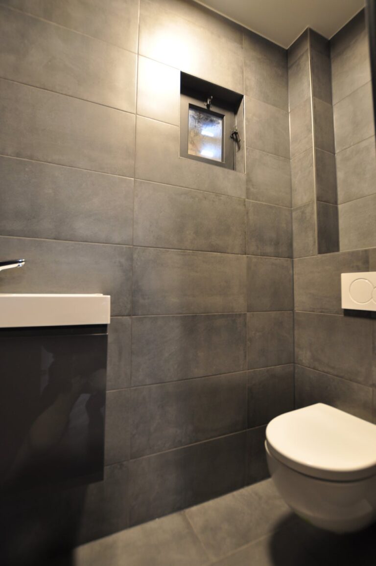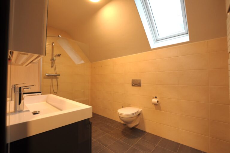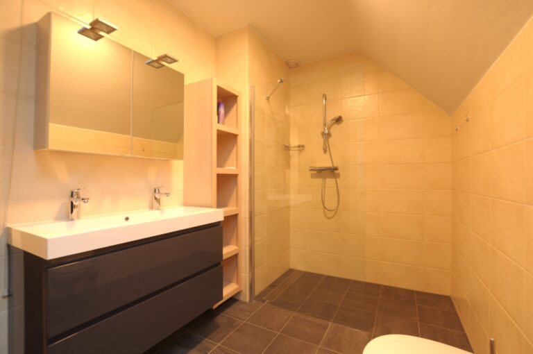 De badkamer is uitgerust met een ruime inloopdouche, dubbele wastafel met ombouw en een toilet.