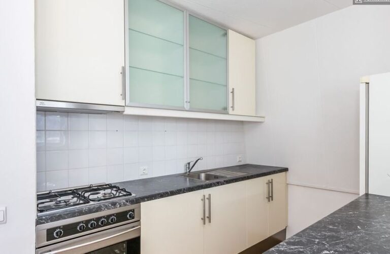 De open keuken wordt van de woonkamer gescheiden door een praktische bar. De moderne inrichting is voorzien van een spoelbak, 4-pits gaskookplaat, afzuigkap, elektrische oven, vaatwasser en koel-/vrieskast. Diverse boven- en onderkasten bieden voldoende bergruimte.