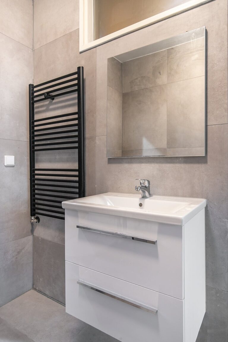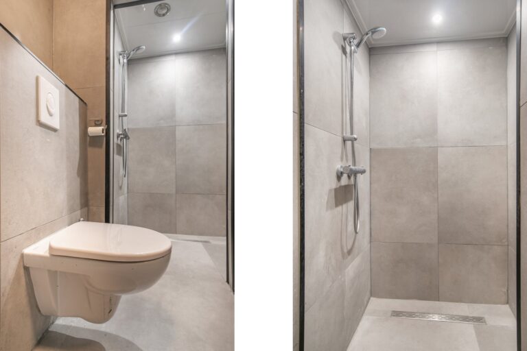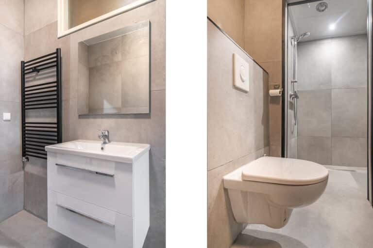 Ook de badkamer is modern van uitstraling dankzij de grote, grijze vloer- en wandtegels. De badkamer is voorzien van een hangend toilet, wastafelmeubel, handdoekenradiator en douche.