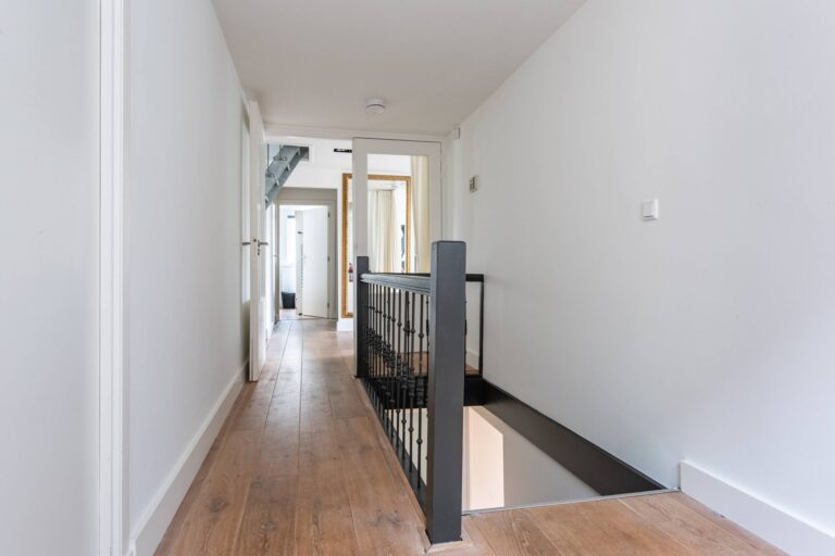 Eerste verdieping: een grote overloop met toegang tot een logeer- of werkkamer van ca. 16m2, een living van ca. 32m2 met zeer veel lichtinval, een nieuwe open keuken v.v. alle apparatuur en openslaande deuren naar het dakterras. Vanuit een tweede portaal toegang tot een nieuwe badkamer met grote inloopdouche, toilet en wastafel met meubel en een slaapkamer van 10m2.
