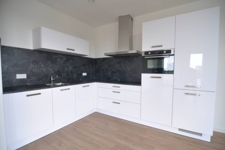 Woonkamer is voorzien van een open keuken met alle gewenste inbouwapparatuur, waaronder een vaatwasser, magnetron-oven combinatie, koelkast en inductie kookplaat.
