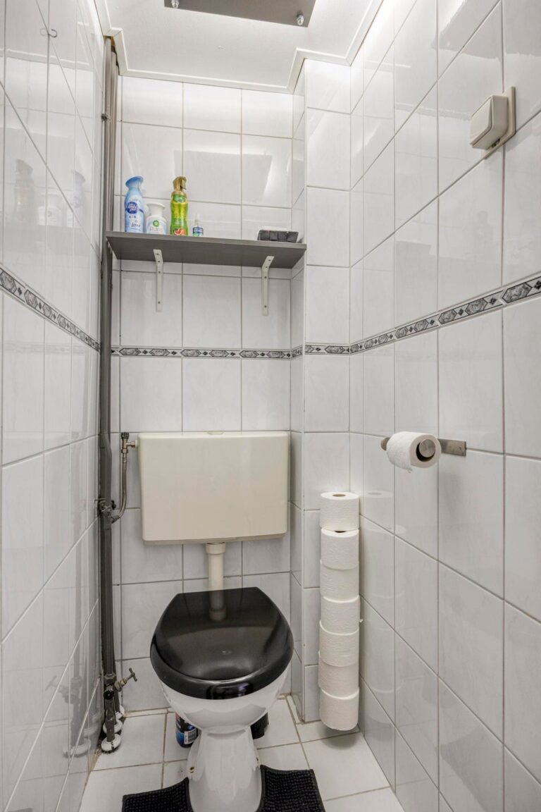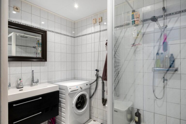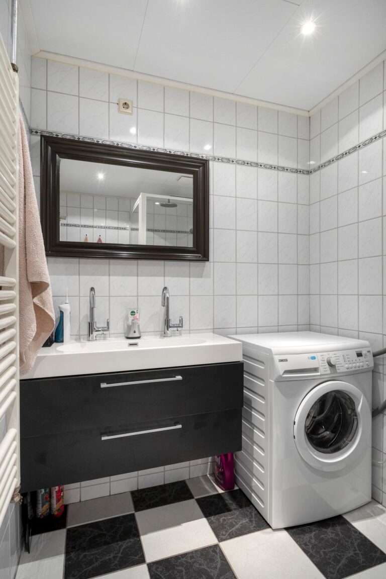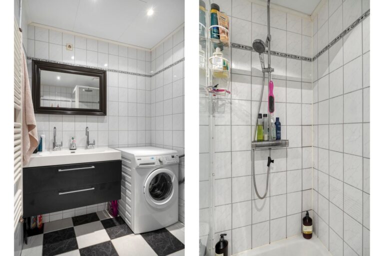 De inpandige badkamer beschikt over een ruime douche, dubbele wastafel, handdoekenradiator en aansluitingen voor wasmachine en droger. Het toilet is apart gerealiseerd en te bereiken via de hal.