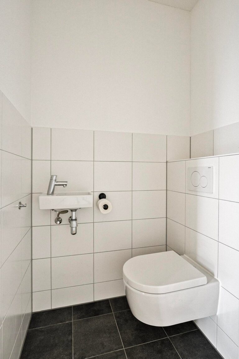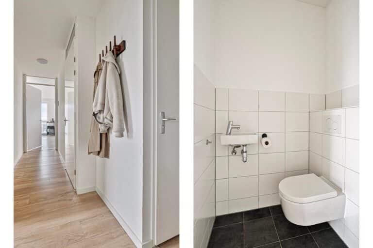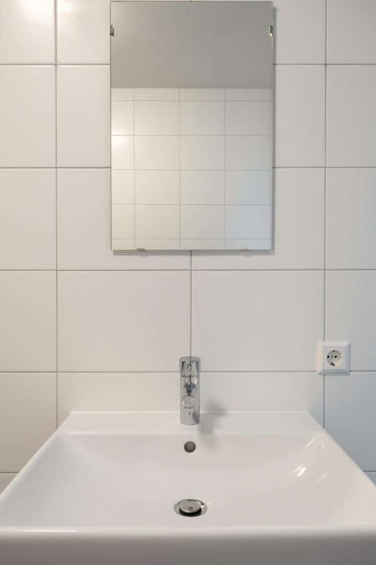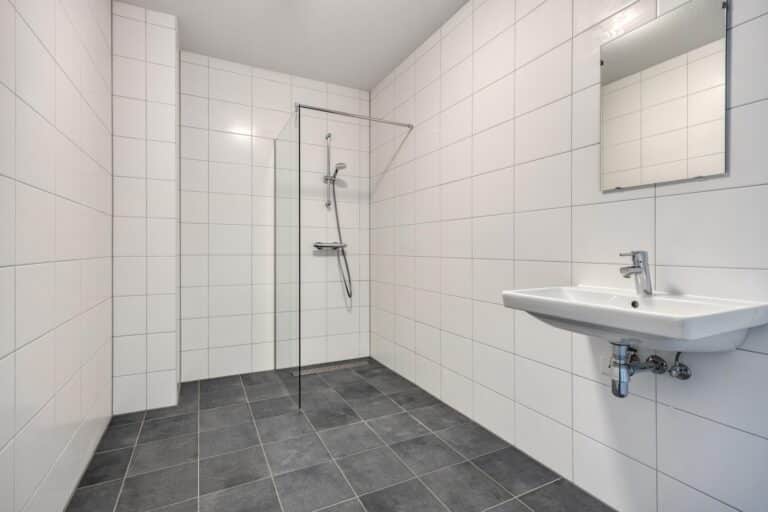 De badkamer wordt uitgevoerd met een douche en wastafel. Het toilet is separaat gerealiseerd en bereikbaar via de hal. De aansluitingen voor wasmachine en droger bevinden zich in de wasruimte.