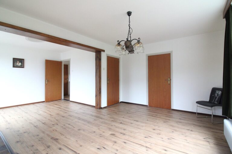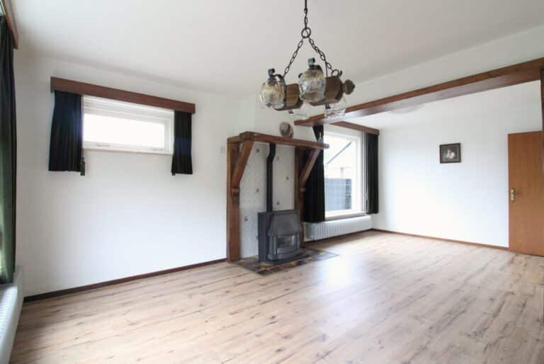 De ruime woonkamer beschikt over grote raampartijen die zorgen voor een prachtige lichtinval. Vanuit hier bereikt u zowel de keuken als de centrale hal.