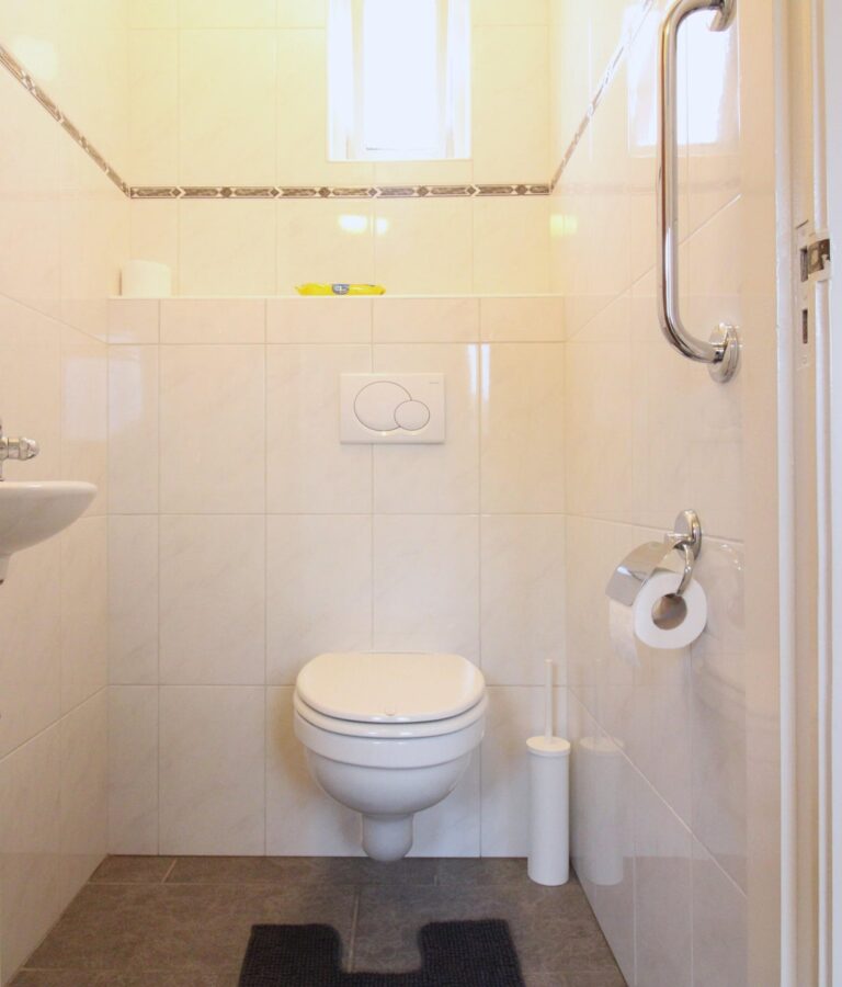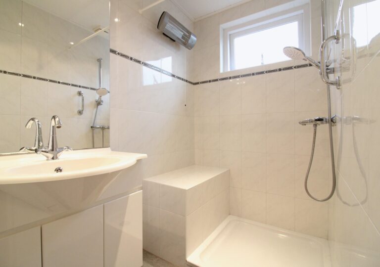 Uitgerust met een douche, wastafel met meubel, extra bergruimte en een stopcontact. Een klein raam zorgt voor natuurlijke ventilatie.