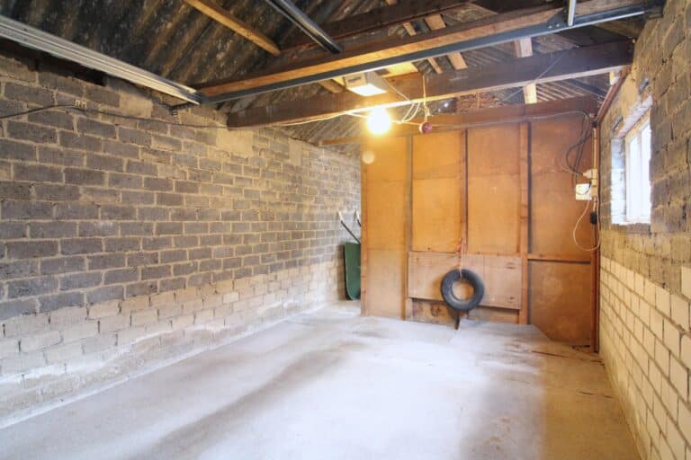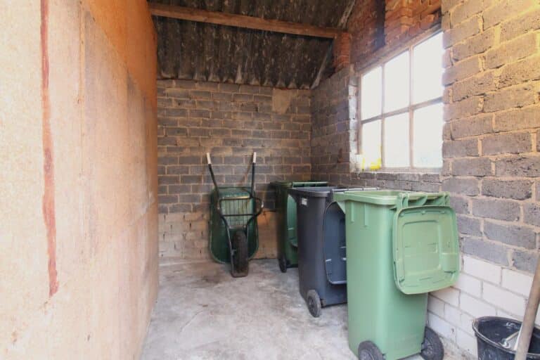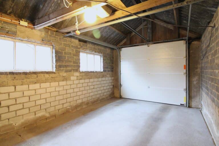 De volledig bestrate achtertuin biedt directe toegang tot de garage en de oprit.