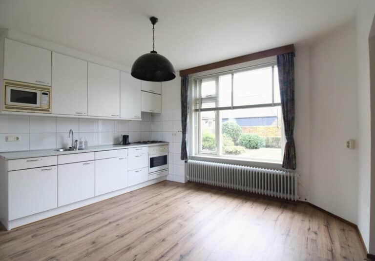 De keuken is voorzien van een oven en magnetron en geniet eveneens van veel daglicht. Vanuit de keuken bereikt u de separate toiletruimte, badkamer, wasruimte en de achtertuin.