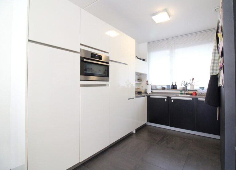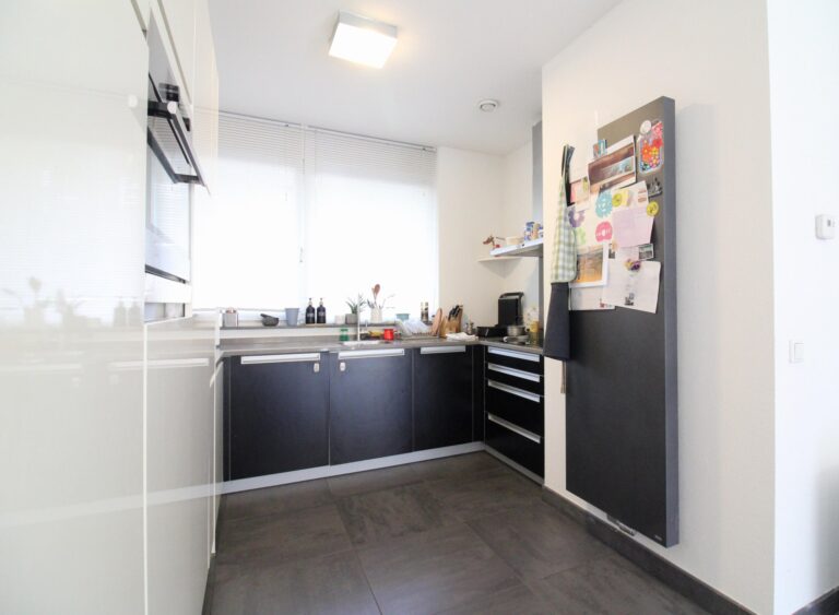 Royale woonkamer voorzien van een fraaie tegelvloer en moderne keuken aan de voorzijde gesitueerd. De keuken is van alle gewenste apparatuur voorzien zoals een combi-magnetron, koelkast, vaatwasser en inductiekookplaat. Vanuit de woonkamer heeft men eveneens toegang tot de fijne achtertuin.