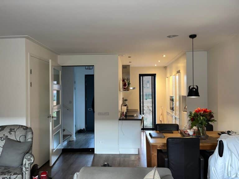Begane grond: entree, hal met apart toilet, woonkamer met houtlook PVC vloer en een moderne en complete open keuken.