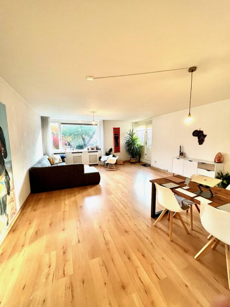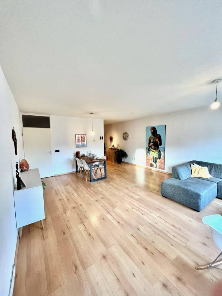 Royale woonkamer/living 35mยฒ (6.88 x 5.16) met veel lichtinval en middels deur toegang tot het terras.