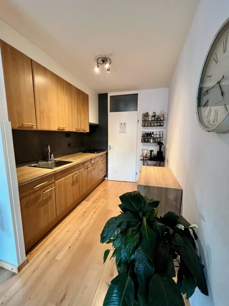 Semi-open keuken 6mยฒ (2.70 x 2.20) met aanbouwcombinatie v.v. koelkast, gasfornuis, spoelbak en afwasmachine. Bijkeuken/berging (2.33 x 1.23) alwaar een oven staat .