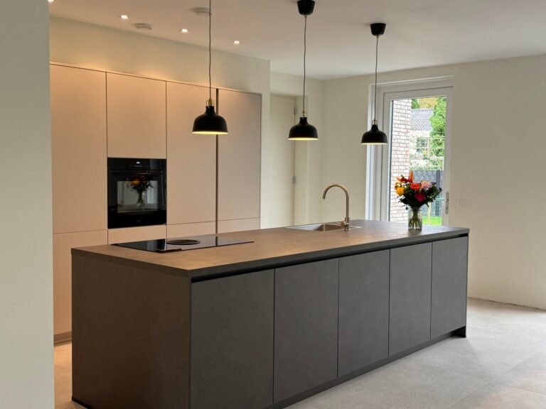 De keuken is opgebouwd uit een groot eiland met o.a. spoelbak, vaatwasser en een bora inductie kookplaat. Verder is er een kasten wand van 3 m met o.a. een grote combi oven/magnetron, een grote koelkast met vriesdeel en veel opbergruimte.