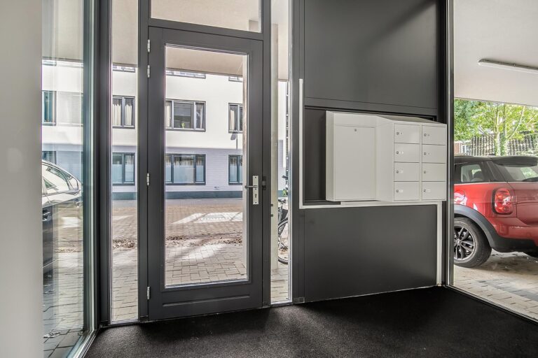 Begane grond: Overdekte entree met parkeerplaatsen, brievenbussen en intercom met camera. Centrale hal met lift en trapopgang naar het appartement. Ook hier is toegang tot de werkloft, een gezamenlijk toilet en een gezamenlijke binnentuin.