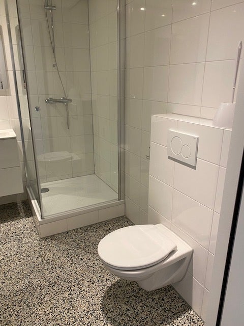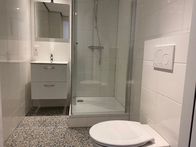 De nieuwe badkamer heeft een douche, wastafel en toilet.