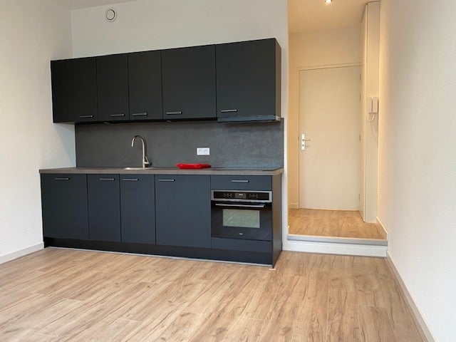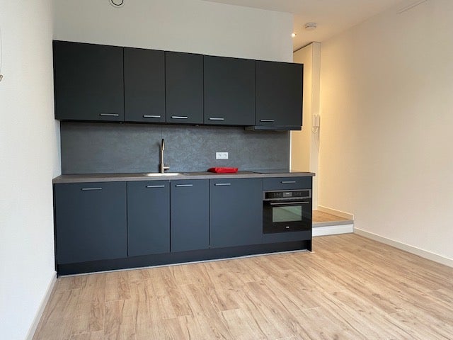 Middels een gezamenlijke toegang is de studio op de 1e verdieping via de trap te bereiken. De oppervlakte van de woonkamer met open keuken bedraagt ca. mยฒ. De keuken bevat een inbouw afzuigkap, kookplaat, vaatwasser en oven.