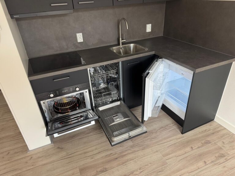 De keuken bevat een inbouw afzuigkap, kookplaat, vaatwasser en oven.De badkamer beschikt over een douche, wastafel en toilet.