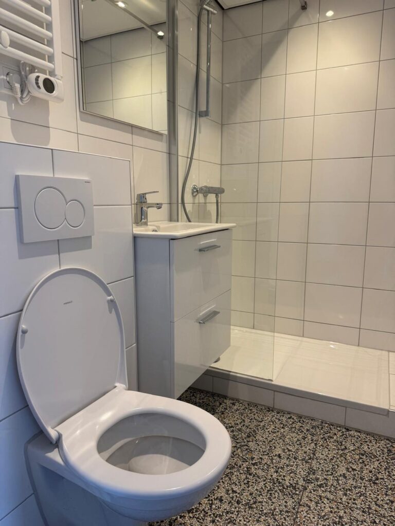 De badkamer beschikt over een douche, wastafel en toilet. Hier is ook de aansluiting voor de wasmachine te vinden.