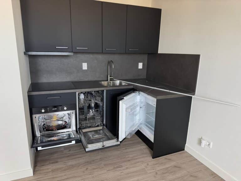 De keuken bevat een inbouw afzuigkap, kookplaat, vaatwasser en oven.