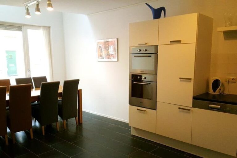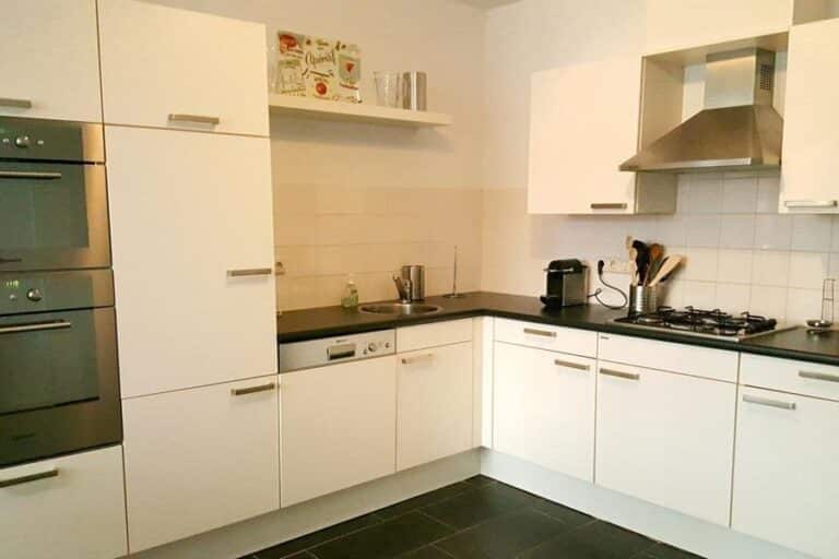 Ruime woonkeuken voorzien van alle gewenste inbouw apparatuur, waaronder een vaatwasser, koelkast, magnetron, oven, 4-pits gasfornuis en een tegelvloer met vloerverwarming.
