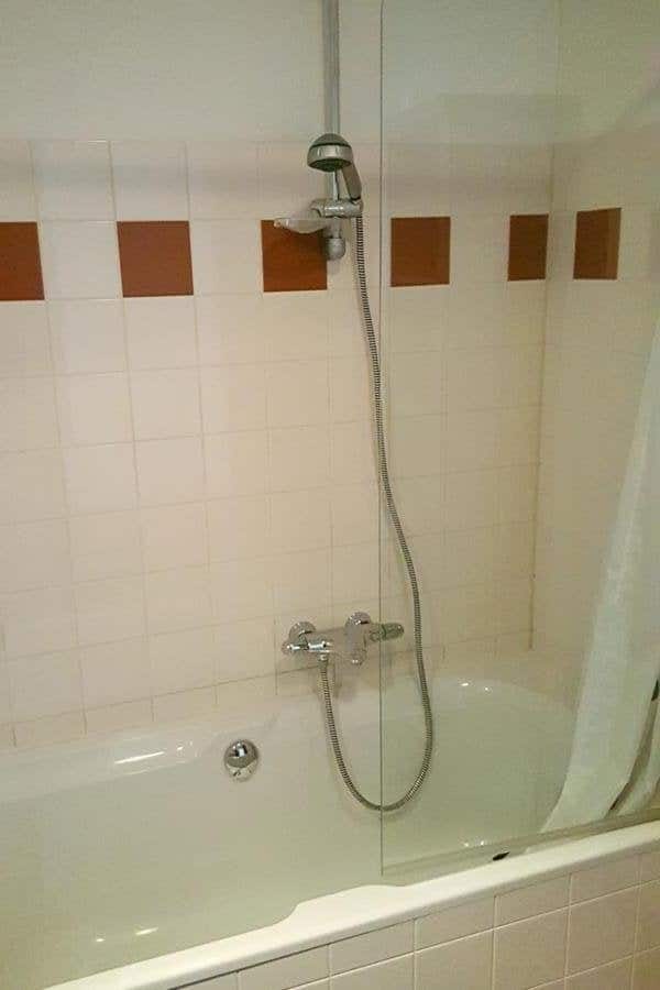 Badkamer voorzien van een ligbad met douchescherm, wastafel en 2e toilet.