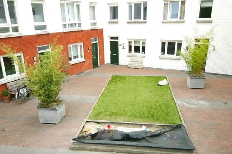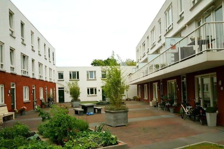 Stadswoning met balkon en privé parkeerplaats in de kelder gelegen aan een hofje.