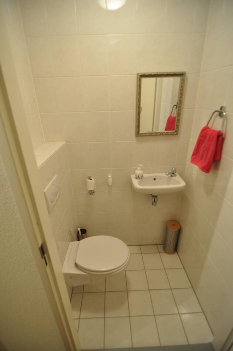 - In de hal treft u verder aan het afzonderlijk, geheel betegeld toilet met fontein