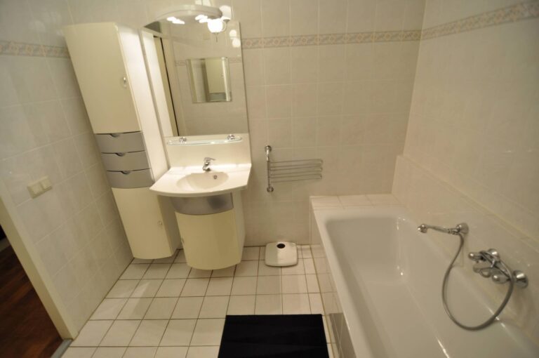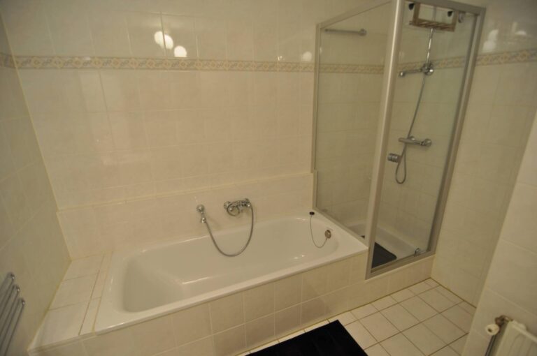 - Geheel betegelde badkamer met ligbad, separate douchecabine en wastafel met geรฏntegreerd meubel en bijbehorende kast, planchet en spiegel