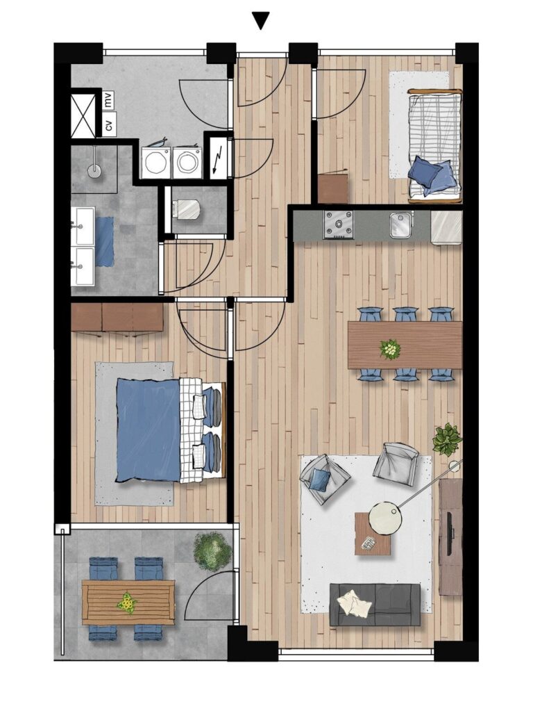 Ruime en lichte woonkamer voorzien van een fraaie designkeuken met alle gewenste apparatuur zoals een 5-pits gaskookplaat, vaatwasser, koelkast, combi-magnetron en afzuigkap. Vanuit de woonkamer middels deur toegang tot het terras. Het terras is gelegen aan de gezellige afgesloten gemeenschappelijke binnentuin welke gebruikt kan worden door de overige bewoners van het complex.