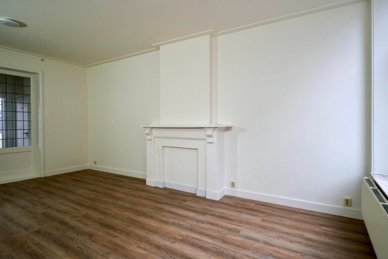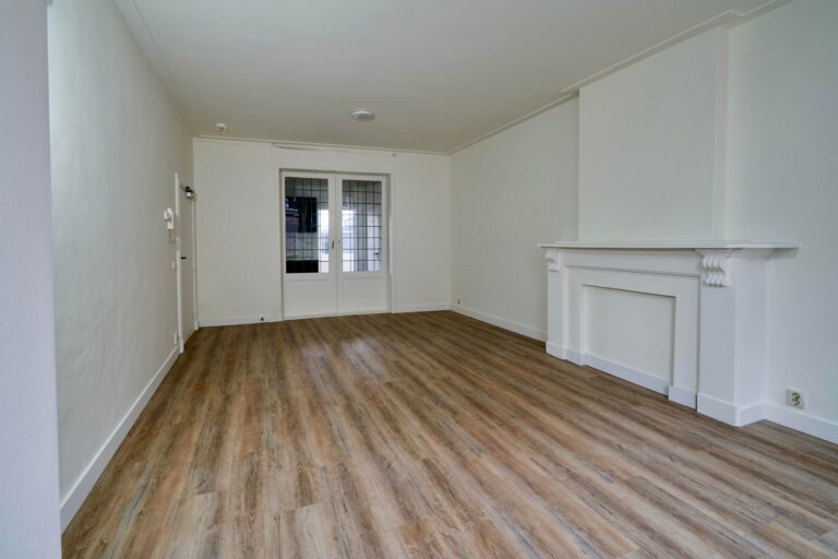 Aan de voorzijde is de ruime woonkamer, de grote vensters zorgen voor veel lichtinval en in combinatie met de hoge plafonds geeft de woning direct het gevoel van veel ruimte en sfeer.