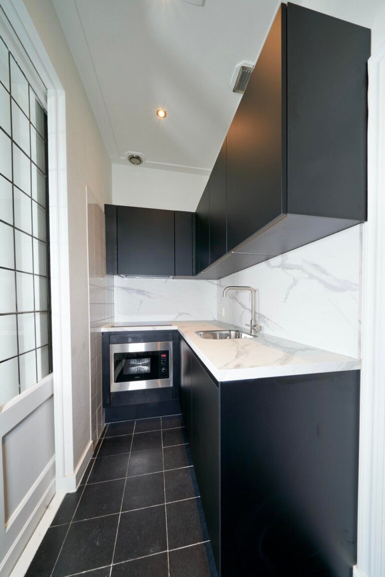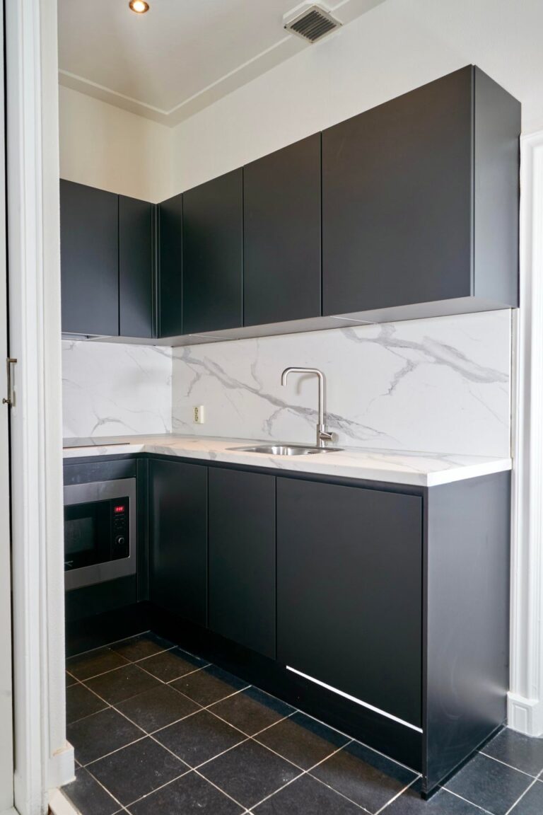 Deze zwarte keuken met luxe aanrechtblad is elegant en modern, en bovenal hyperefficiënt vormgegeven. Er is een afwasmachine, een inductieplaat, een afzuigkap, een combi oven/magnetron en een spoelbak. Door de L-opstelling is deze zeer efficiënt. De keuken is recent geplaatst en dus helemaal nieuw!