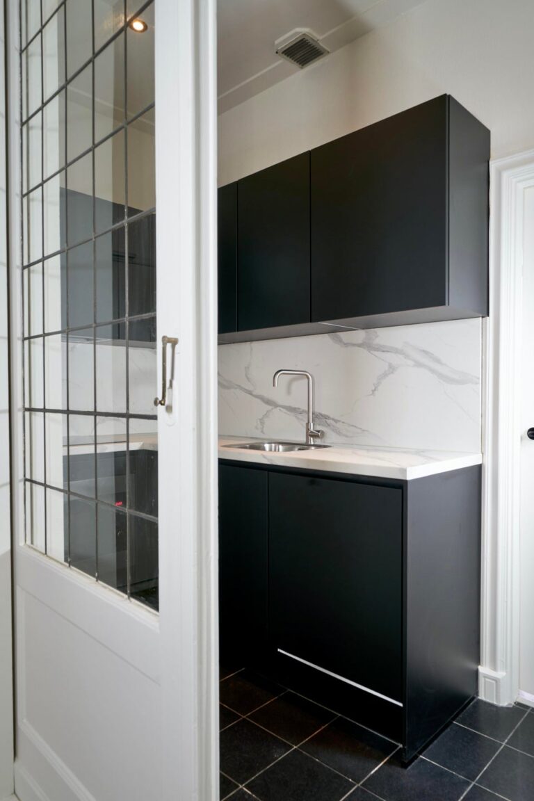Via de authentieke schuifdeuren (met origineel glaswerk) kom je in de praktische keuken.