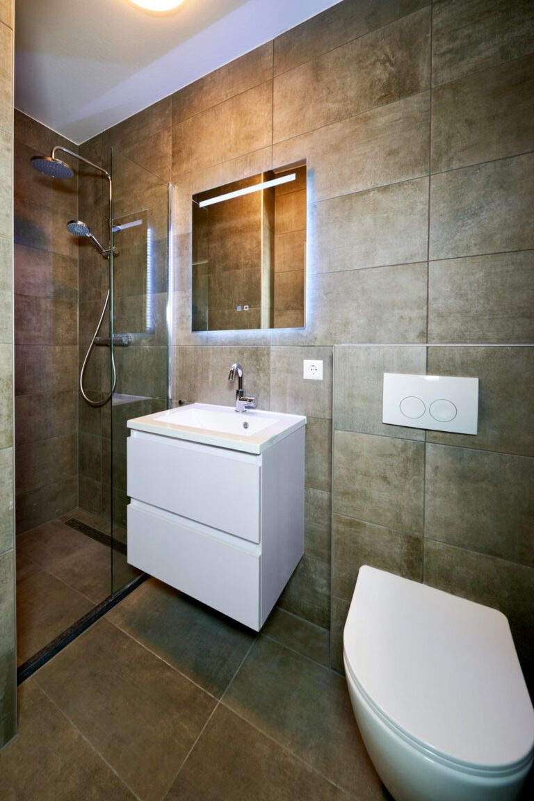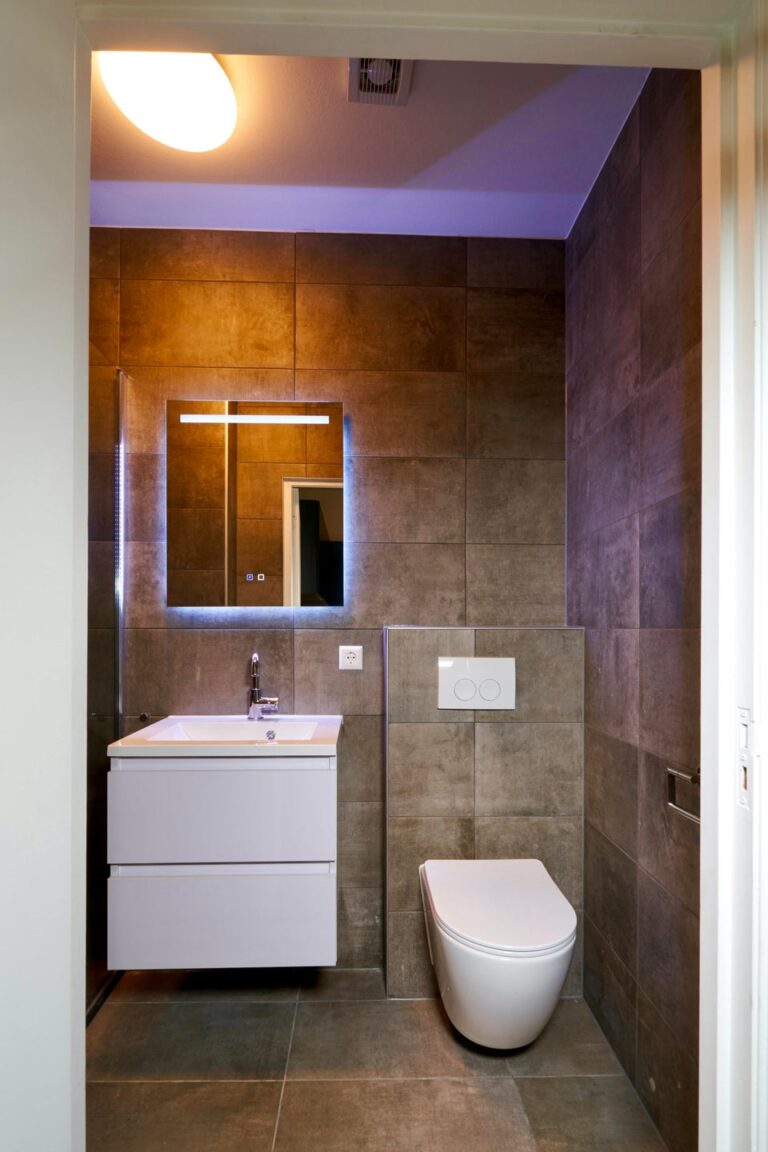 Aan de rechterzijde van de keuken bevindt zich kleine en fraaie badkamer, deze is recent geplaatst en dus ook volledig nieuw. De badkamer bestaat uit een WC met hangtoilet, een wastafelmeubel en een (regen)douche.