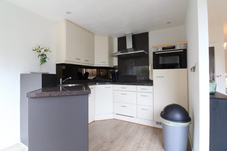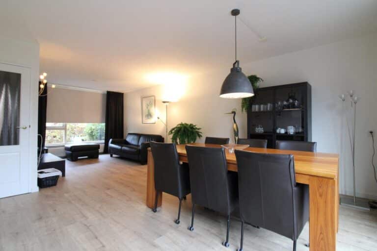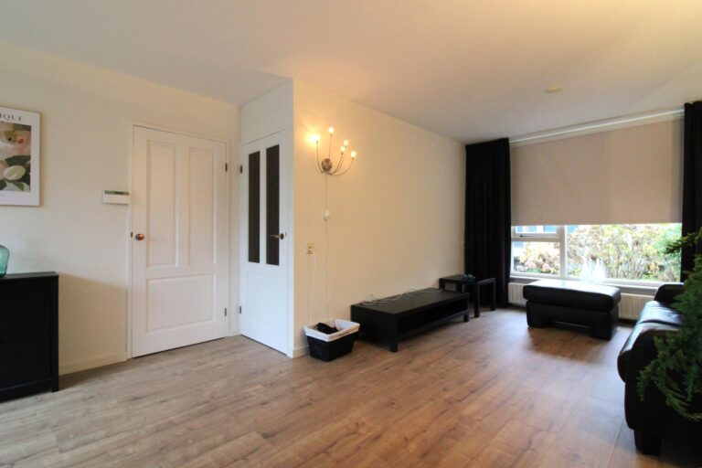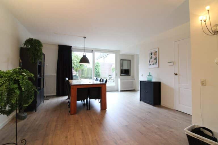 De living biedt toegang tot de ruime, zonnige achtertuin en een terras. De verhuurder zal tevens nog zorg dragen voor de installatie van een smart-TV. Toilet gelegen op de begane grond, nabij de trapopgang naar de 1e etage.