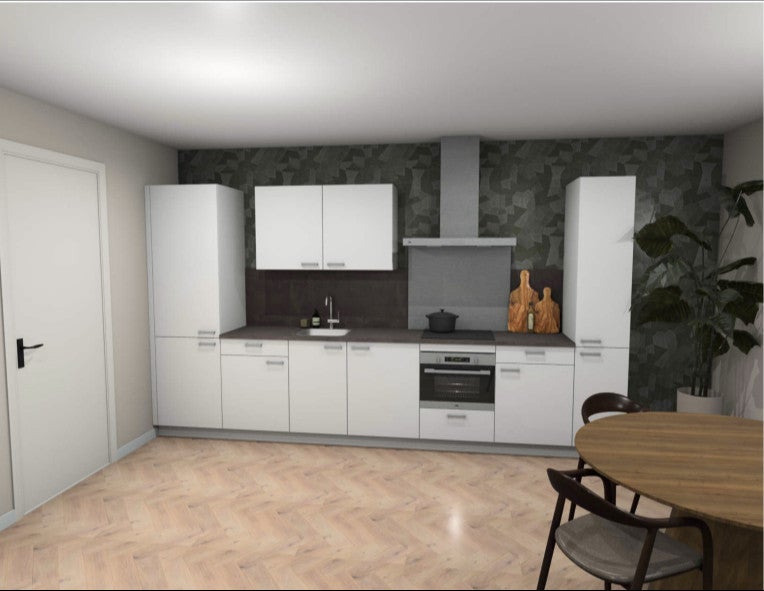 De keuken is modern afgewerkt met witte kastjes en een donkergrijs werkblad, en uitgerust met hoogwaardige apparatuur zoals een koel-vriescombinatie, inductieplaat, wasemkap (recirculatie), combi magnetron, vaatwasser en een enkele spoelbak met 1 handmengkraan.