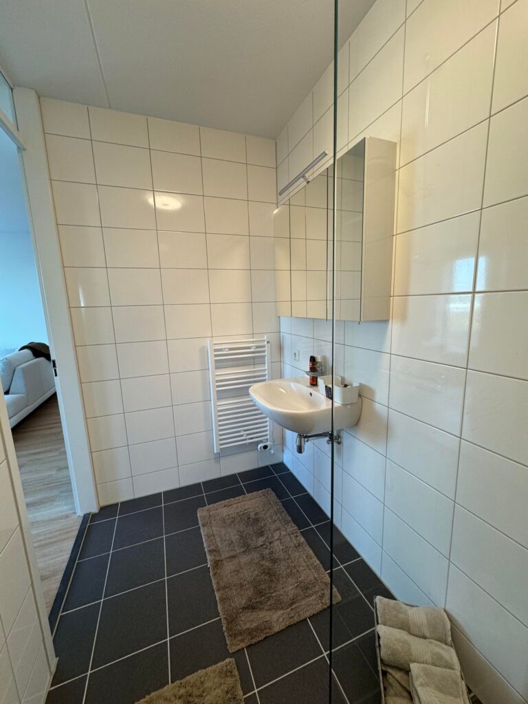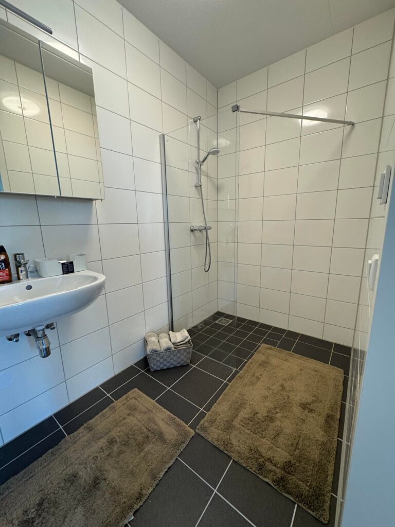 master slaapkamer en fijne maat 2de slaapkamer. De volledig betegelde badkamer is voorzien van een inloopdouche en wastafel. In de
