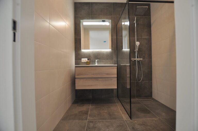 Moderne badkamer voorzien van een ruime inloopdouche en wastafel met meubel.