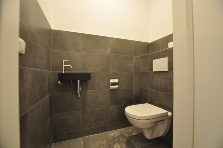 1e etage: Entree appartement: Hal voorzien van gastentoilet met fonteintje, inpandige bergruimte voorzien van de warmtepomp en toegang tot de woonkamer.
