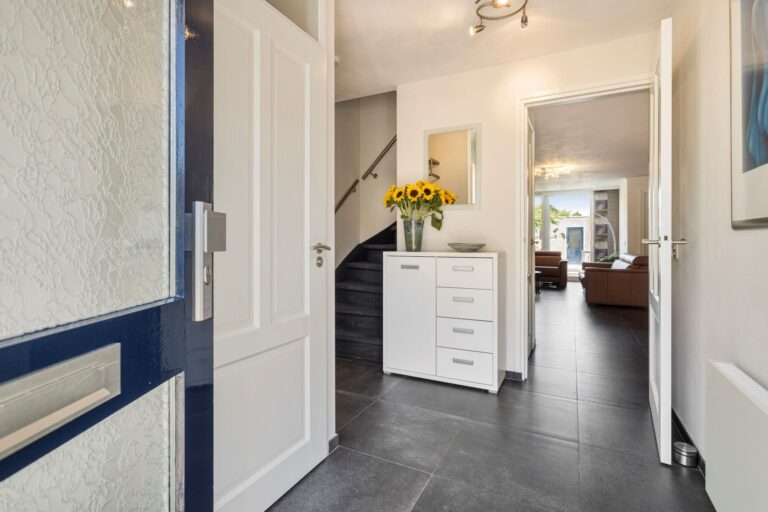 Overdekte entree; royale hal voorzien van tegelvloer met vloerverwarming, meterkast en trapopgang naar 1e verdieping.