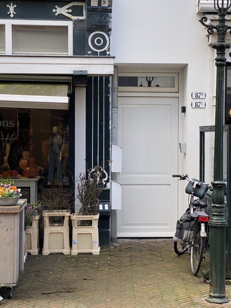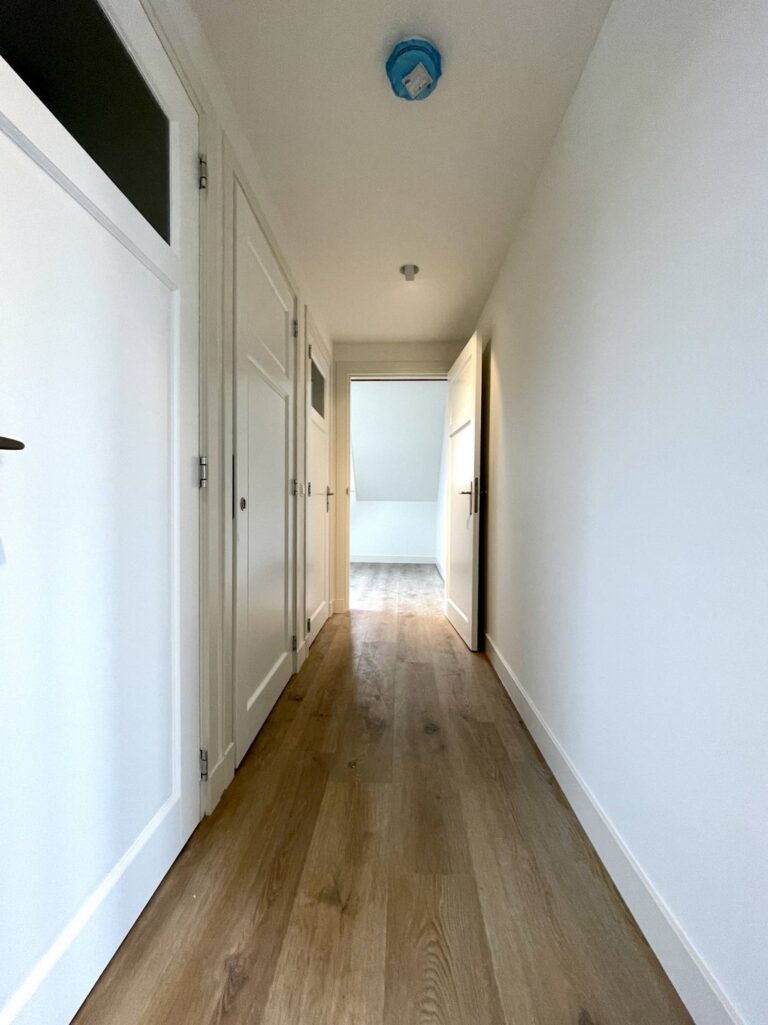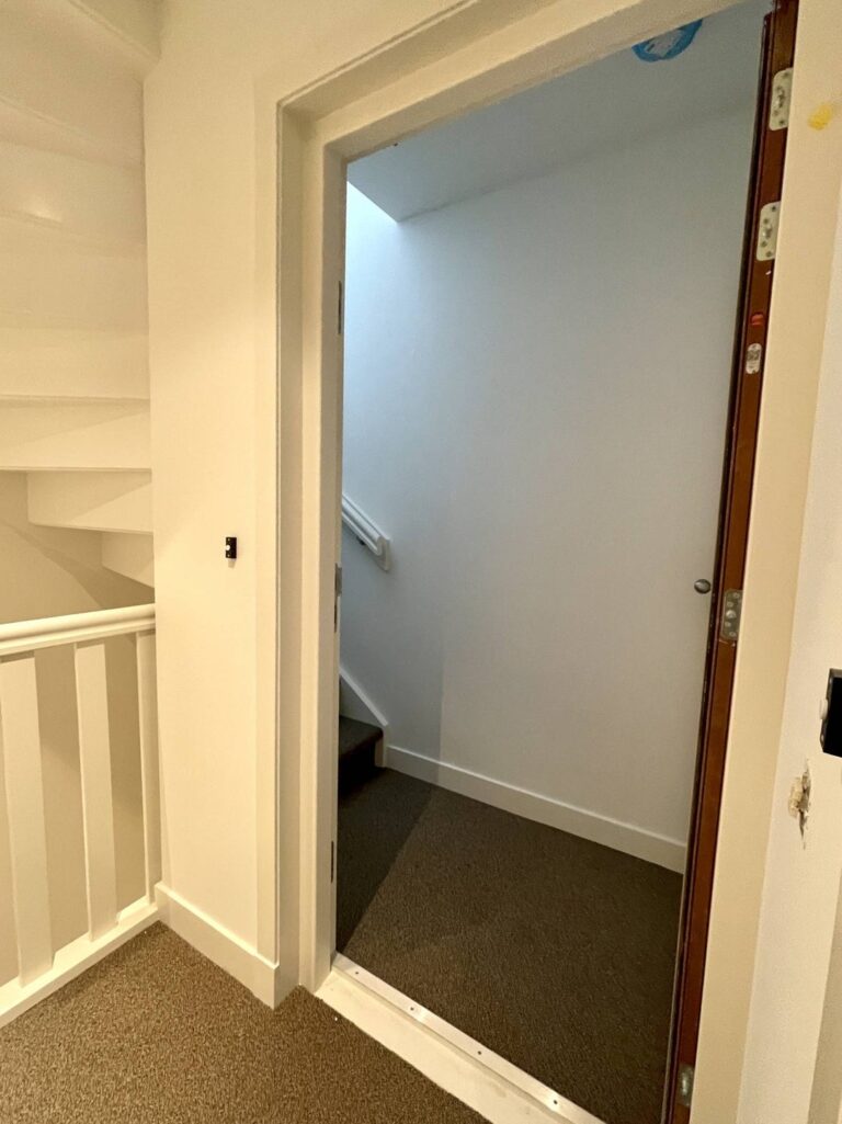Trap omhoog naar 2e verdieping; entree appartement, hal met toilet, luxe badkamer en slaapkamer (14m2).