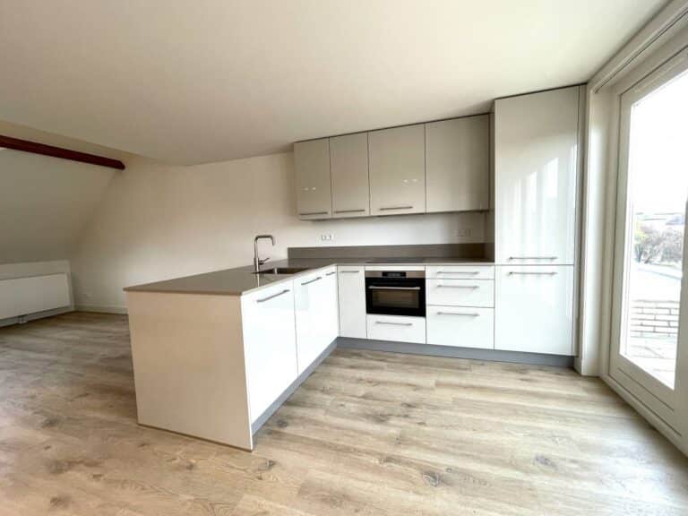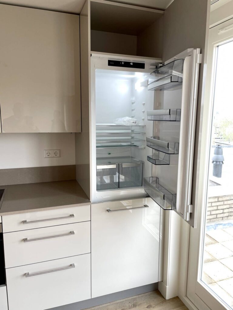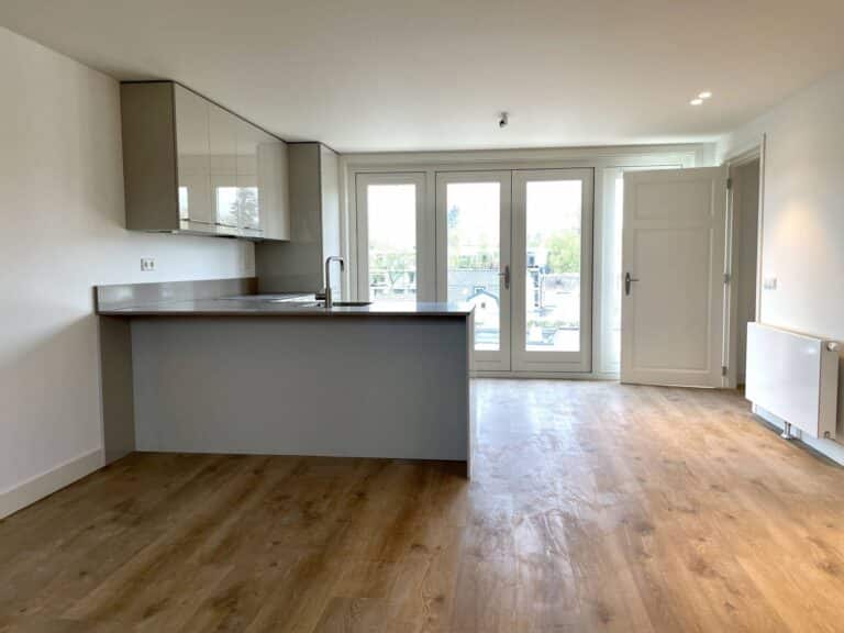 Woonkamer met open keuken (36m2). De keuken is voorzien van apparatuur zoals; ijskast met vriesladen, inductie kookplaat, vaatwasmachine en afzuigkap.