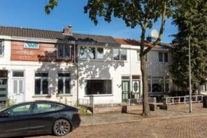 Nabij het centrum, NS-station en uitvalswegen (naar Amsterdam/Utrecht) gelegen tussenwoning met 3 slaapkamers, voor- en achtertuin (patio) met achterom en een ruim dakterras.