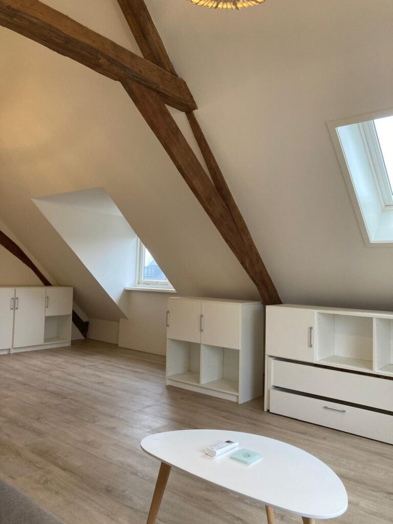 De kamer is gelegen op de 1ste verdieping. De kamer bestaat uit een woon/slaapkamer met een eigen badkamer. De woon/slaapkamer (ca. 20m2) is al deels gemeubileerd met een bank, gordijnen, salon tafel, kasten en 2x hanglampen.