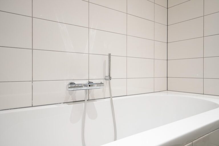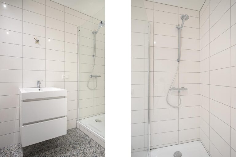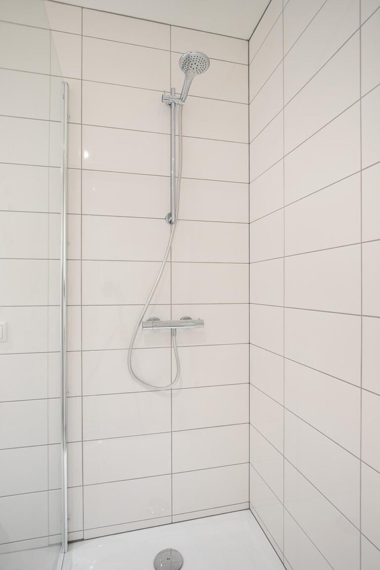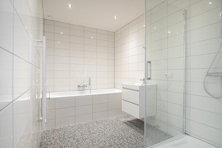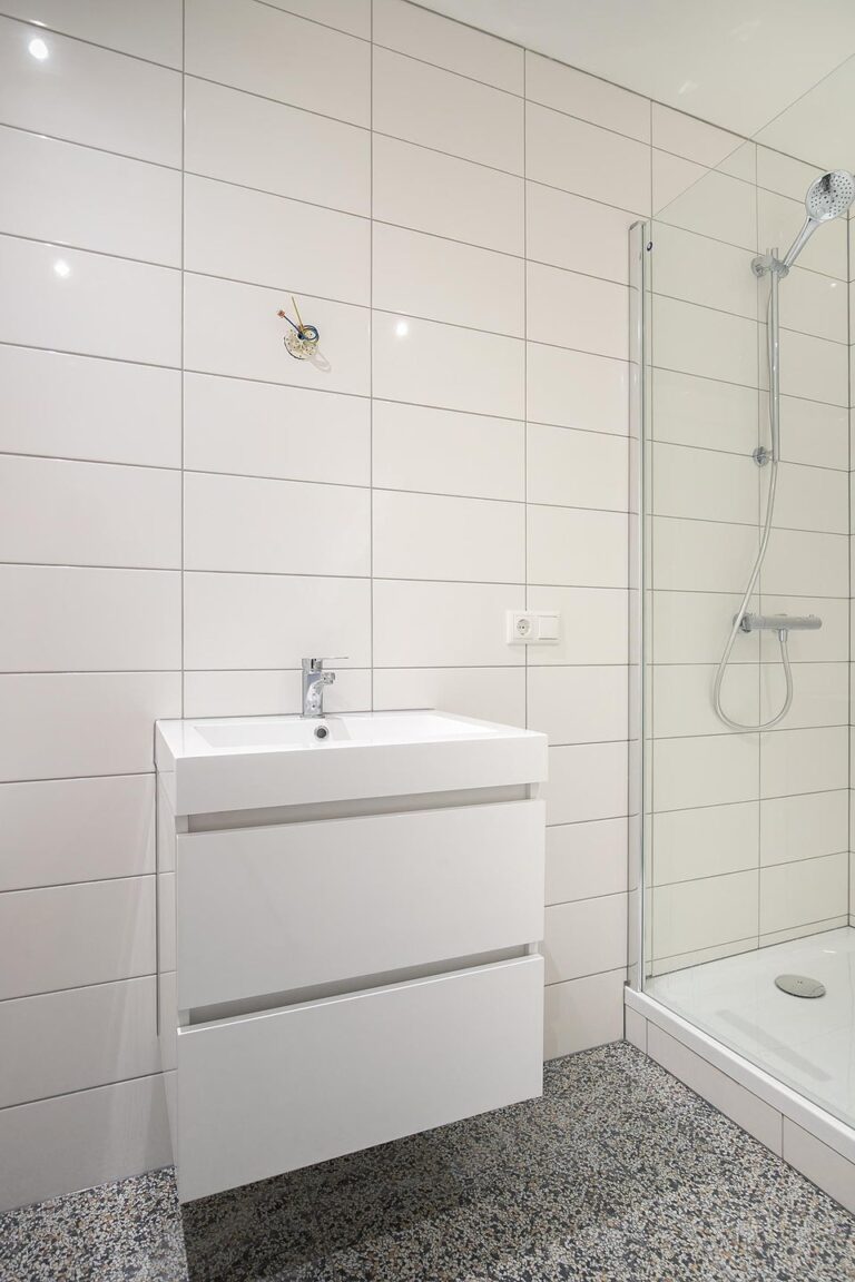 De badkamer heeft een bad en aparte doucheruimte. tevens een handoekenradiator en net wastafelmeubel. Er is een aparte wasruimte.