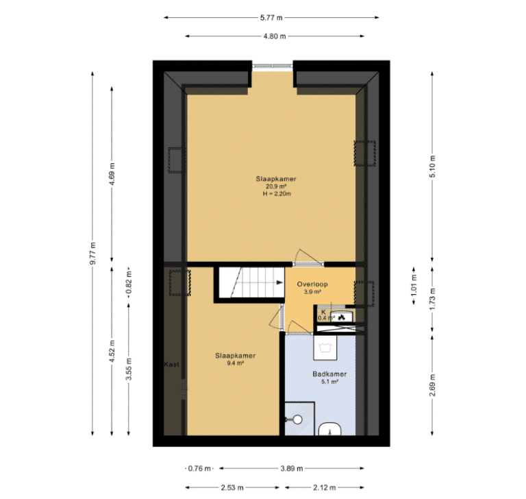 Open trap naar de verdieping met twee ruime slaapkamers eveneens v.v. houten vloeren van circa 20m2 en 9m2 separate badkamer met douche en wasmachine aansluiting. Uitstekend geïsoleerd appartement met energielabel A.